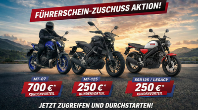 Hol dir jetzt deinen Yamaha Zuschuss! Du hast deinen Führerschein frisch bestanden oder steigst auf die nächste Klasse um? Dann lohnt sich dein Start auf zwei Rädern jetzt doppelt, denn für ausgewählte Yamaha Modelle bekommst du einen attraktiven Führerschein-Zuschuss beim Neukauf. Sichere dir deinen Preisvorteil auf diese Bikes: MT-07: 700 €* Führerschein-Zuschuss MT-125: 250 €* Führerschein-Zuschuss XSR125 / XSR125 Legacy: 250 €* Führerschein-Zuschuss Egal ob A1, A2, A, Aufstieg oder B196, mit diesen Modellen findest du den perfekten Einstieg oder das nächste Upgrade für noch mehr Fahrspaß, Style und Freiheit. Jetzt Bike auswählen und durchstarten! *Gültig bis 30.06.2026 für nicht zugelassene Neufahrzeuge bei erfolgreicher Prüfung.