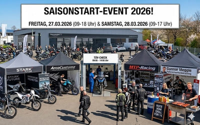 Die neue Motorradsaison steht vor der Tür und wir feiern den Start gemeinsam! Am Freitag den 27.03.2026 (09-18 Uhr) und Samstag den 28.03.2026 (09-17 Uhr) laden wir dich herzlich zu unserem großen Saisonstart-Event ein. Freu dich auf spannende Aktionen, interessante Aussteller und die perfekte Gelegenheit, dein Bike fit für die Saison zu machen. Das erwartet dich: Rote vom Grill für 1€ Tagesaktueller TÜV-Check (Samstag)Am Samstag kannst du von 09:00 bis 14:00 Uhr dein Motorrad direkt vor Ort checken lassen. Vorstellung unserer neuen Marke STARK FUTURELerne unsere neue Marke kennen und entdecke spannende Neuheiten. Live-Folierung von ArcoCustomzErlebe live, wie eine professionelle Bike-Folierung inklusive Beratung rund um Design, Schutz und Individualisierung entsteht. Infostand MTP-RacingHol dir Tipps und Beratung zu Motorrad-Zubehör direkt von den Profis. Infostand Fahrsicherheitstraining von Gunnar MeggleInformiere dich über Trainings, Touren und Möglichkeiten, deine Fahrtechnik noch weiter zu verbessern. Komm vorbei, triff andere Motorradbegeisterte, entdecke Neues und starte gemeinsam mit uns in eine großartige Saison 2026. Wir freuen uns auf deinen Besuch!